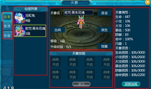 【仙宠信息】1、功能列表(左侧):默认为仙宠信息,点击可切换打开资质修炼,技能学习;2、仙宠列表(左侧):展示当前所拥有的仙宠,点击对应的仙宠可查看仙宠的详细信息;3、仙宠信息(中上):展示当前所选择的仙宠相关信息,可进行改名、出战/休息、放生、炫耀等相关操作,并展示仙宠目前等级升级所需要的经验;4、仙宠技能(中下):展示当前所选择的仙宠技能情况,当仙宠达到对应的条件后即可进行技能学习,点击学习按钮切换到技能学习界面;5、仙宠属性(右侧):展示当前所选择的仙宠详细属性,点击资质修炼按钮切换到资质修炼界面;