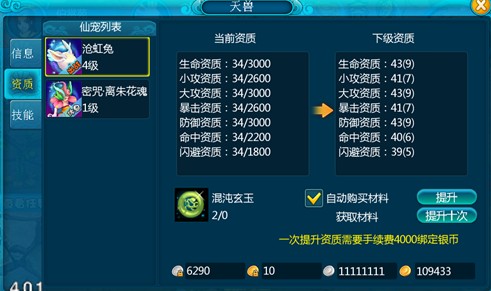 【资质修炼】1、当前资质:展示当前所选仙宠的资质属性;2、提升资质:展示当前所选仙宠提升后的资质属性;3、混沌玄玉:资质提升所需的道具,可从游戏活动中获得,也可从商城购买获得;
