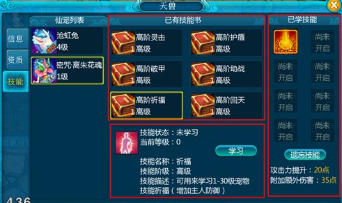 【技能学习】1、已有技能书:展示玩家当前拥有的技能书;2、技能说明:展示当前所选择技能书的详细信息,点击学习按钮即可习得技能;3、已学技能:展示当前宠物已经学得的技能,点击技能并点选遗忘技能可遗忘对应技能;